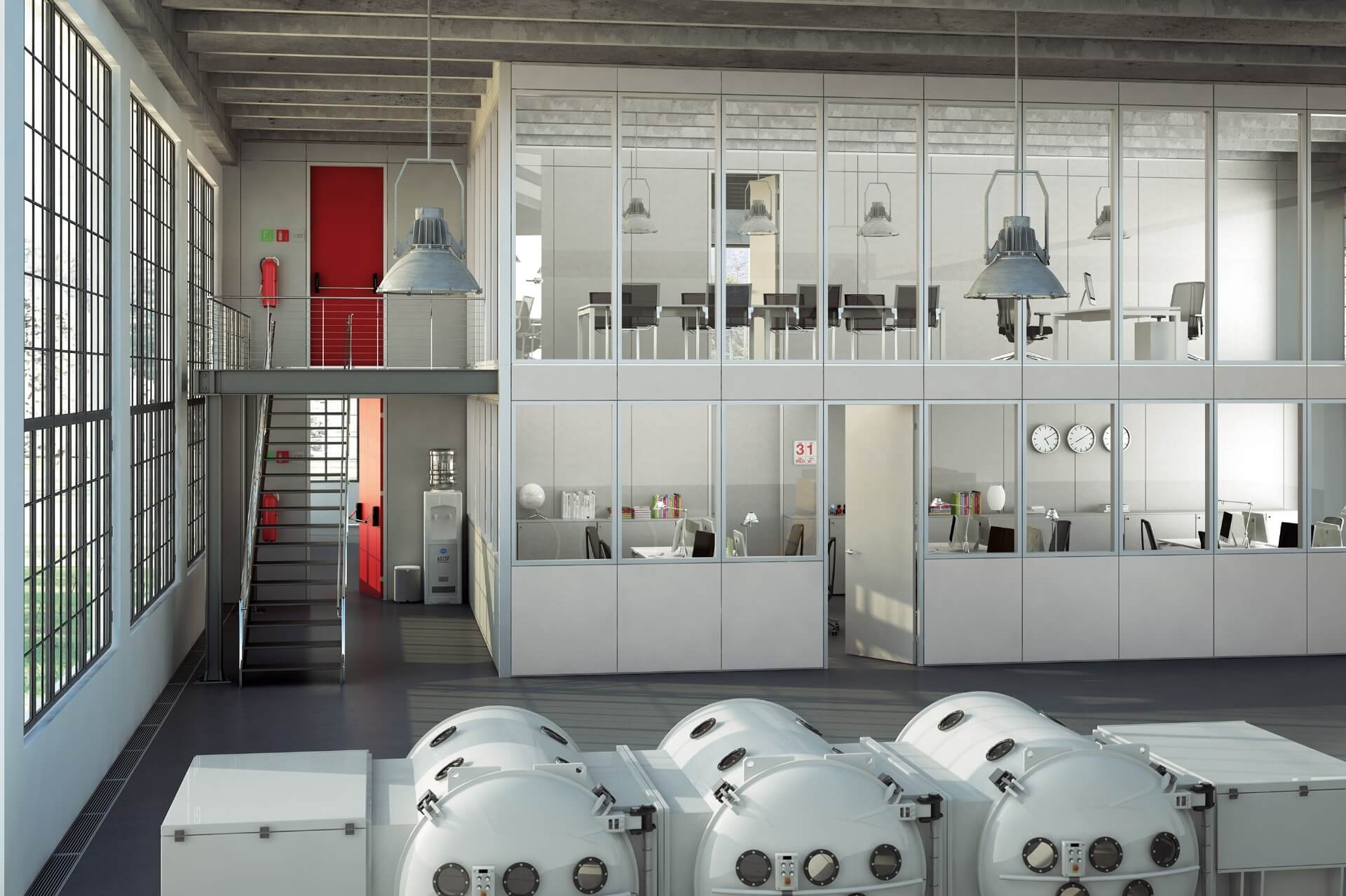 Pareti divisorie di spessore nominale cm 10, moduli di misure standard, composte internamente da montanti verticali e traversi orizzontali in profilato di alluminio. Il modulo vetrato è composto da una lastra in vetro stratificato di spessore mm. 3+3, o in alternativa un vetro camera di mm. 4+12+4, posizionata al centro di un doppia cornice in alluminio, munita di guarnizione morbida in PVC di colore grigio o nero. E' possibile il montaggio di una tendina a lamelle regolabili in orizzontale.