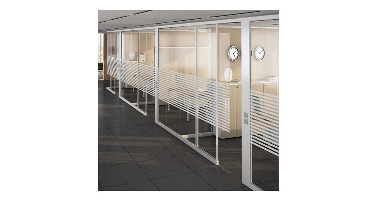 Parete divisoria monolitica in vetro, composta da una struttura perimetrale in alluminio estruso, dotata di sistemi tecnici per una regolazione del fuorisquadro fino a 40 mm.