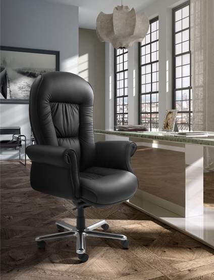 Una poltrona direzionale con braccioli imbottiti interamente rivestita in pelle dal design maestoso per l'arredo di uno studio o ufficio; Doge Lux ci permette di fare un salto indietro nel tempo, con una poltrona presidenziale praticamente perfetta per chi ricerca solidita' ( la seduta e' garantita per portare fino a 150 kg) ed eleganza al tempo stesso. Un robusto basamento in pressofusione di alluminio lucidato, una meccanismo che consente un movimento sincronizzato di sedile e schienale, tutto contribuisce a rendere Doge Lux la regina delle poltrone in pelle per uffici, studi direzionali e presidenziali dal design classico.